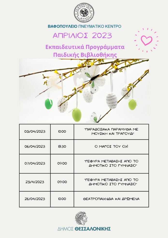 ΔημοσιεύσειςΘέλω να ενημερωθώΑνακοινώσειςΒΠΚ: Απρίλιος - Πρόγραμμα Εκπαιδευτικών Προγραμμάτων Παιδικής Βιβλιοθήκης Βαφοπουλείου Πνευματικού Κέντρου Διεύθυνση Βαφοπουλείου και Πνευματικών ΙδρυμάτωνΘέλω να ενημερωθώΑνακοινώσειςΔιεύθυνση Βαφοπουλείου Πνευματικού Κέντρου και Αρχείων ΒΠΚ: Απρίλιος – Πρόγραμμα Εκπαιδευτικών Προγραμμάτων Παιδικής Βιβλιοθήκης Βαφοπουλείου Πνευματικού Κέντρου 03/04/2023 13:57 Πληροφορίες: Βαφοπούλειο Πνευματικό Κέντρο ΕΤΙΚΕΤΕΣ#vafopoulio#vafopouliopneumatikokentro#vpk FacebookTwitterLinkedinEmailΤυπώνωCopy URL ΤΕΛΕΥΤΑΙΕΣ ΑΝΑΡΤΗΣΕΙΣ Ανακοινώσεις ΕΚΘΕΣΗ «ΤΟ ΛΟΥΒΡΟ ΤΟΥ ΠΟΛΥΚΛΕΙΤΟΥ ΡΕΓΚΟΥ» ΒΑΦΟΠΟΥΛΕΙΟ ΠΝΕΥΜΑΤΙΚΟ ΚΕΝΤΡΟ 07/10/2025 14:40 Ανακοινώσεις Πίνακες αποτελεσμάτων της υπ’ αρ. ΣΜΕ 9/2025 Πρόσκλησης Εκδήλωσης Ενδιαφέροντος 07/10/2025 13:56 Δελτία τύπου «Τουμπιώτικα 2025» από τον Δήμο Θεσσαλονίκης & την Δ’ Δημοτική Κοινότητα 07/10/2025 13:28 Προηγούμενο άρθροΑπρίλιος 2023 – Πρόγραμμα εκδηλώσεων Κεντρικής Παιδικής ΒιβλιοθήκηςΕπόμενο άρθροΣΥΝΟΔΕΥΤΙΚΑ ΜΕΤΡΑ ΠΡΟΓΡΑΜΜΑΤΟΣ ΤΕΒΑ ΔΗΜΟΥ ΘΕΣΣΑΛΟΝΙΚΗΣ ΟΡΓΑΝΩΣΗ ΕΚΠΑΙΔΕΥΤΙΚΩΝ ΗΜΕΡΙΔΩΝ/ΠΡΟΓΡΑΜΜΑΤΩΝ ΤΟ 2022